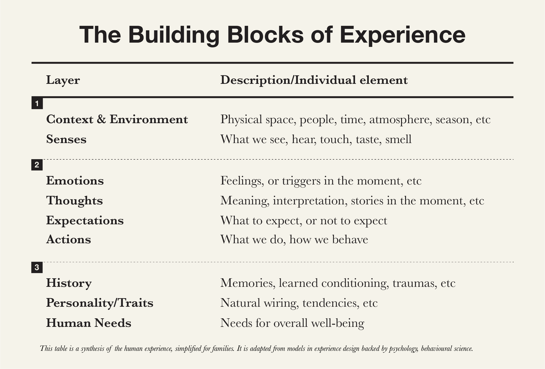 An experience is made up of three key layers moving from superficial (1) to deeply personal (3). Each layer holds individual elements that contribute to the experience.